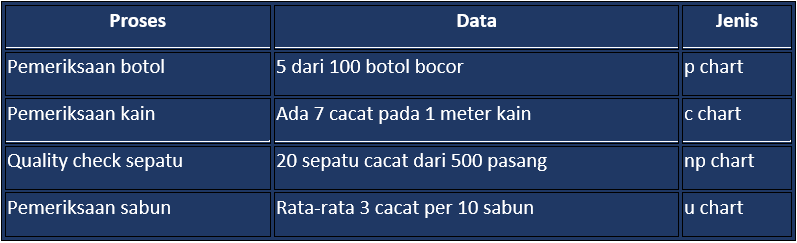 Attribute data adalah data yang menggambarkan apakah suatu item memenuhi syarat atau tidak (baik/buruk, lolos/tidak, cacat/tidak), atau berapa jumlah kejadian tertentu dalam satu unit.